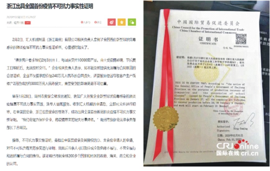 目前,除中国国际贸易促进委员会2月2日向浙江湖州一制造企业出具全国首份《新型冠状病毒感染的肺炎疫情不可抗力事实性证明》外,尚未有司法解释或相关政策文件将本次疫情定性为不可抗力事件。